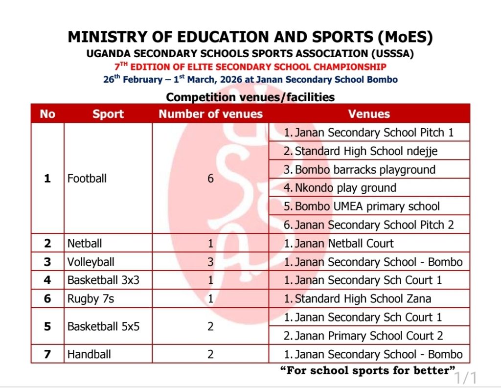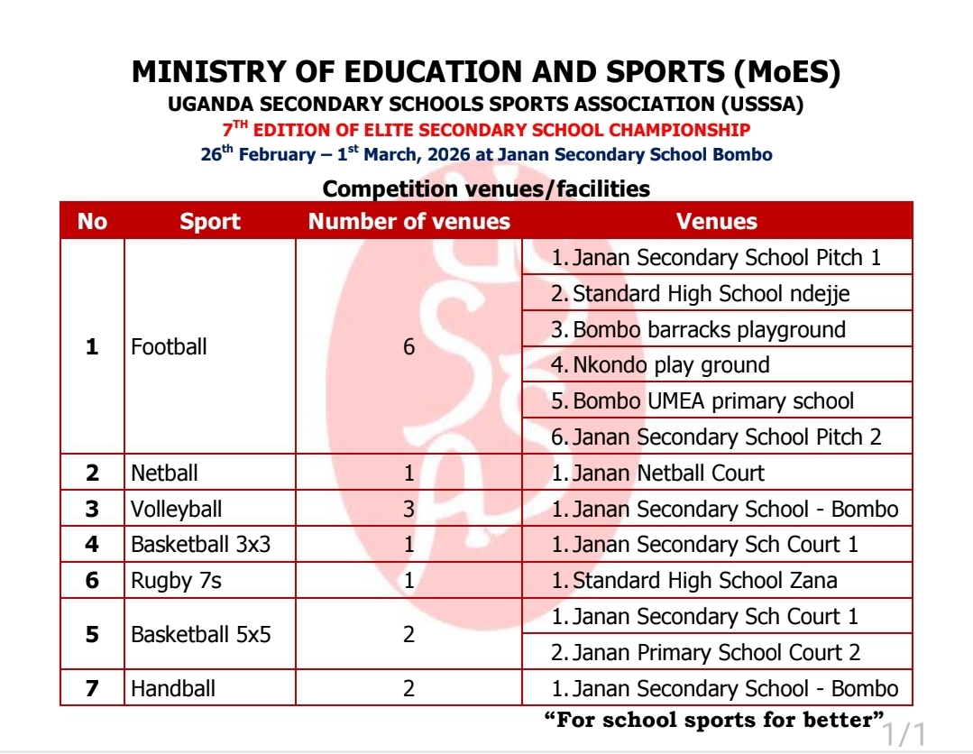 Football will be played on 6 grounds, at Janan SS, Standard High Ndejje Campus among others.